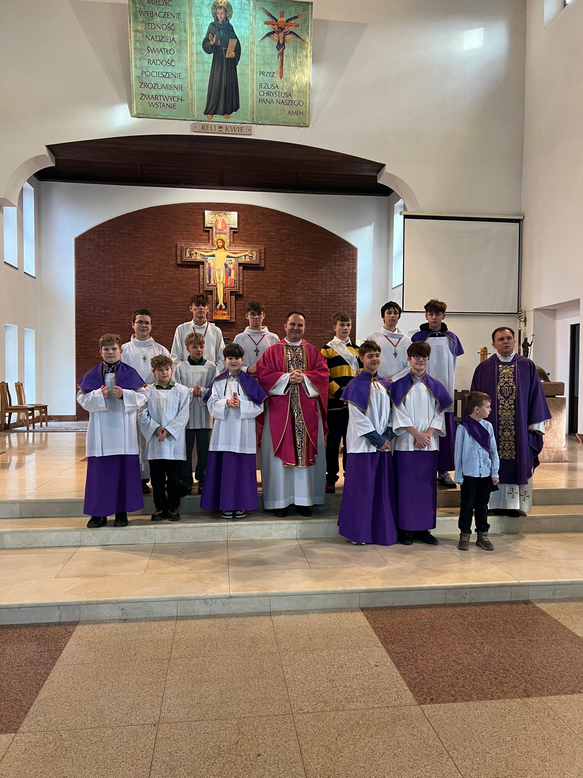 Podczas Mszy Świętej ministranci, którzy przez długi czas sumiennie pełnili swoją posługę zostali uroczyście wyróżnieni przez przybyłego do naszej parafii Ojca Roberta Wołyńca - Wikariusza Prowincji oraz otrzymali oni nowe stopnie. Awans był wyrazem uznania za ich zaangażowanie, systematyczną obecność oraz gotowość do służby przy ołtarzu. Każdy z nich podejmując nowe obowiązki potwierdził chęć dalszego rozwoju duchowego i odpowiedzialnej służby Bogu oraz wspólnocie parafialnej kierując się słowami św. Ignacego Loyoli : "Ad Majorem Dei Gloriam"; czyli "Wszystko na cześć i chwałę Boga".